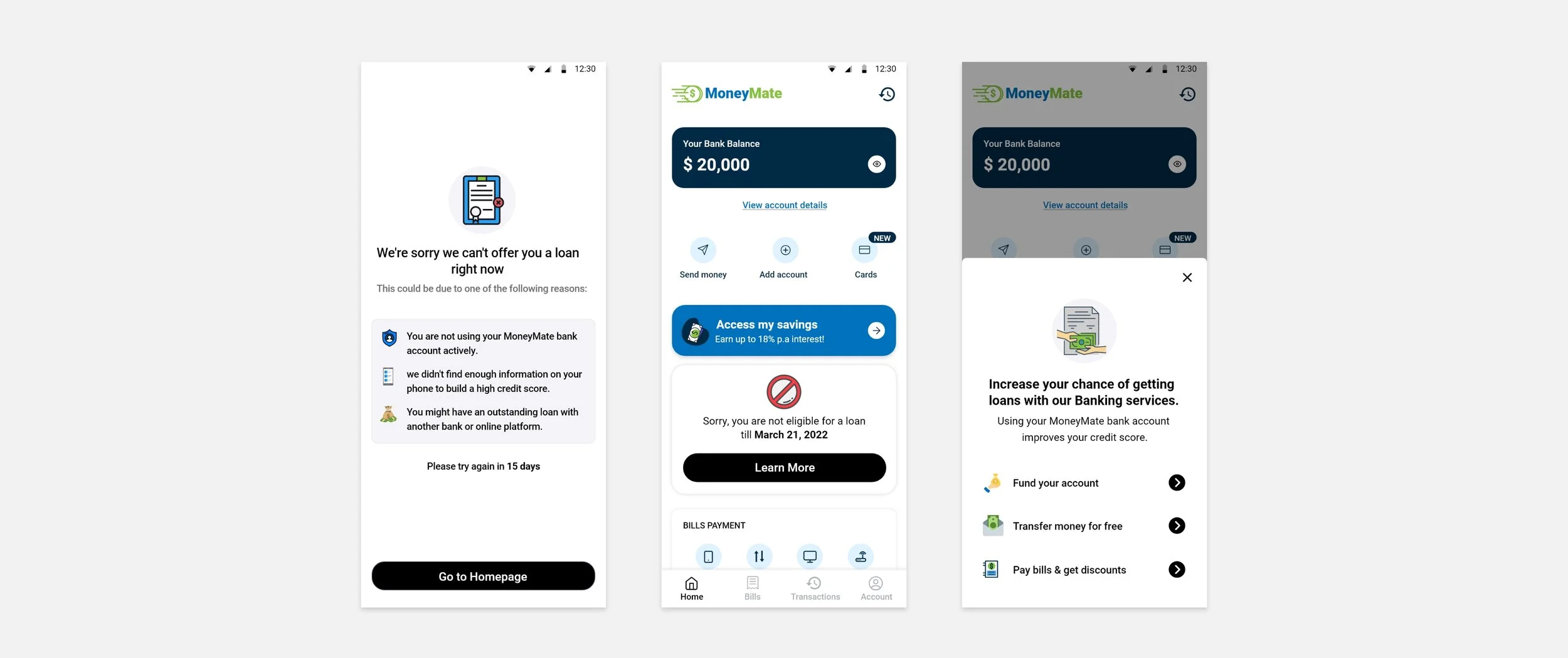 For users whose loan requests were declined, using MoenyMate banking services would help increase their credit score.