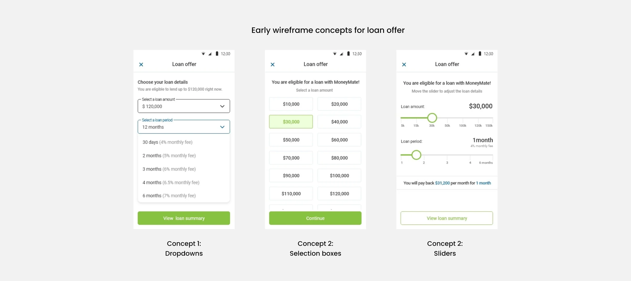 In the redesign, I substituted the horizontal layout for a vertical one to keep the loan terms simple. Adding percentages next to the months and showing a payment breakdown once a tenor is selected also helps further simplify our offer terms.
