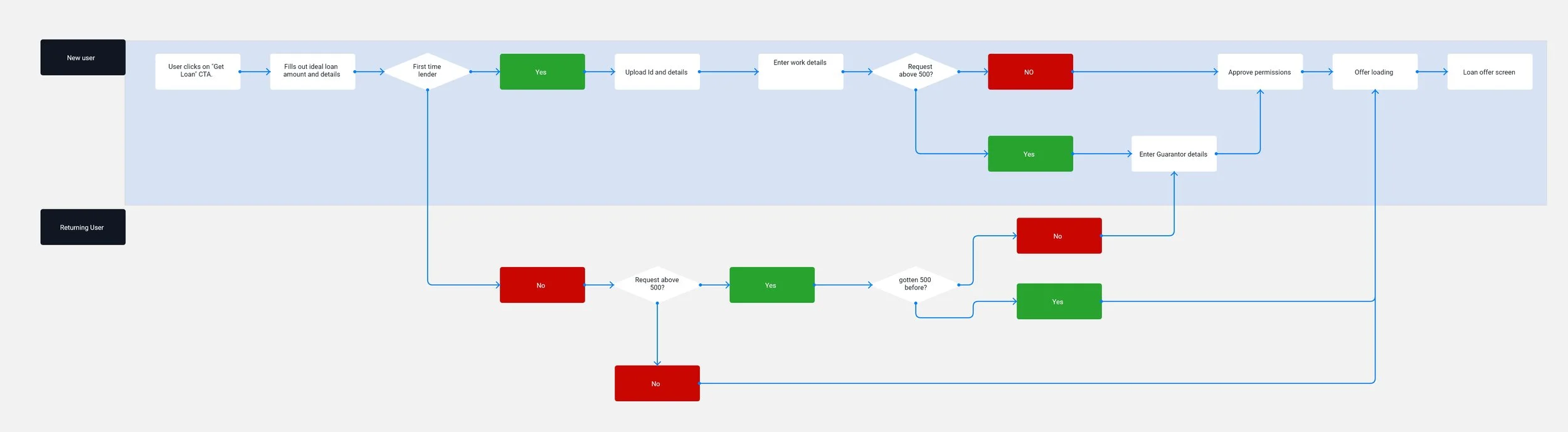 We needed to audit the entire lending funnel before we could overhaul. The first step was to put all the various screens and states into a single user flow so everyone on the team could see what the customer’s journey currently looked like from end to end.