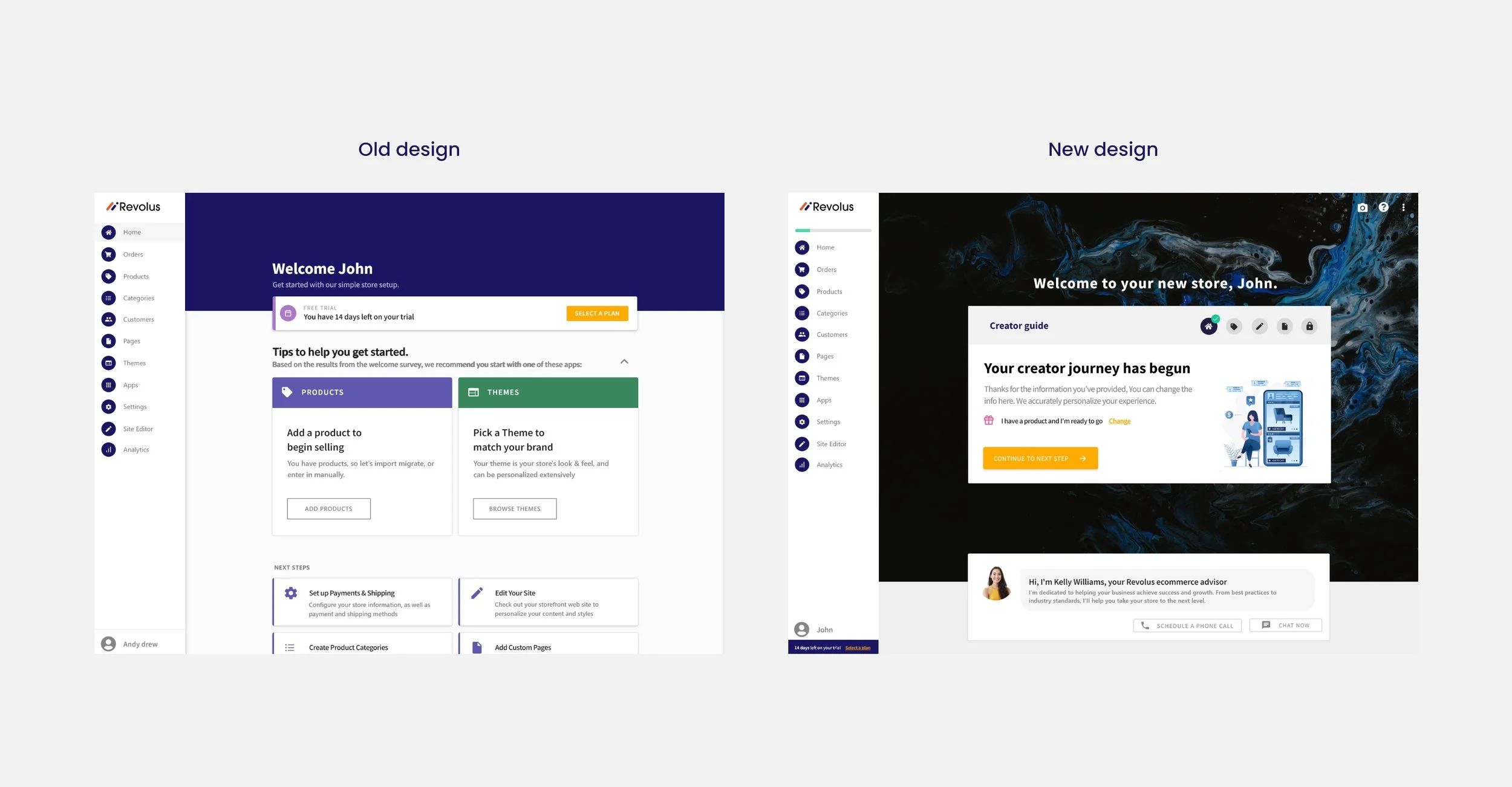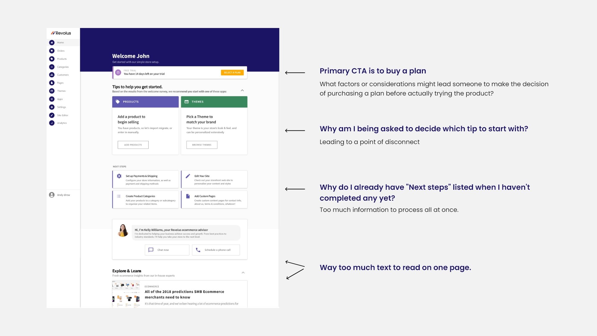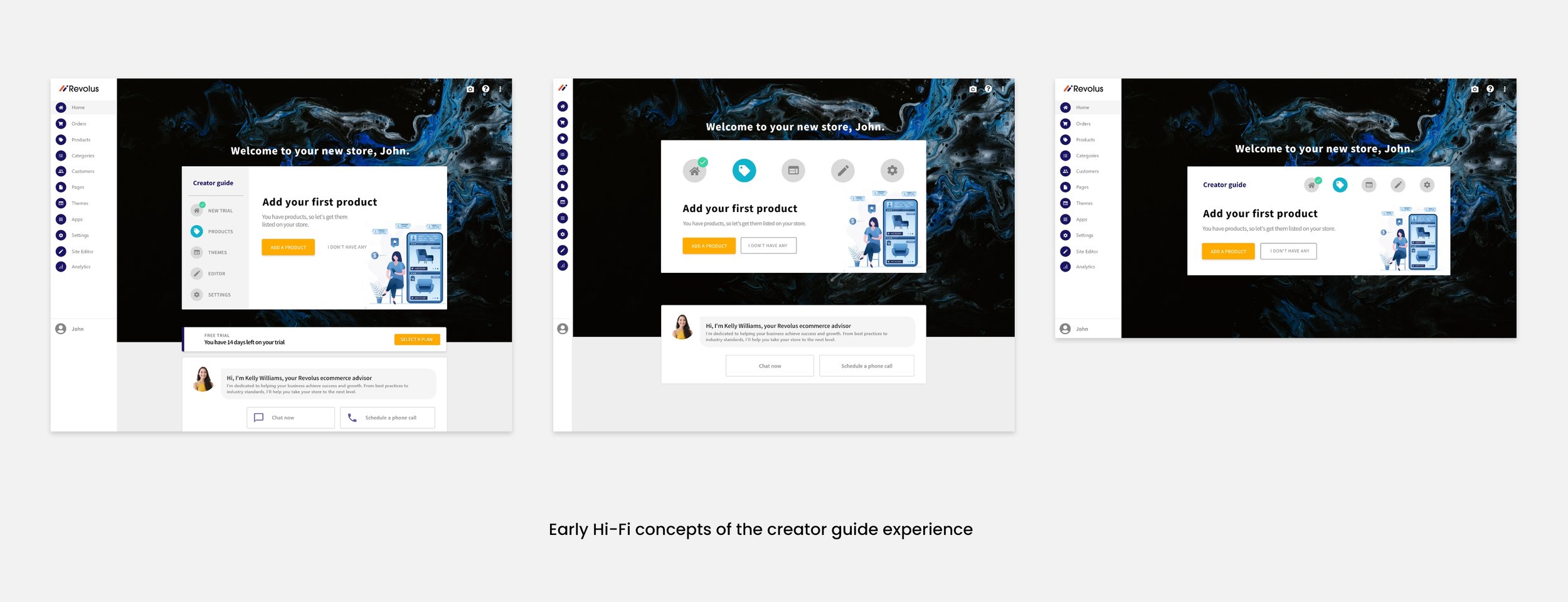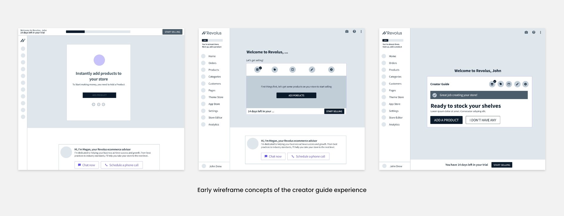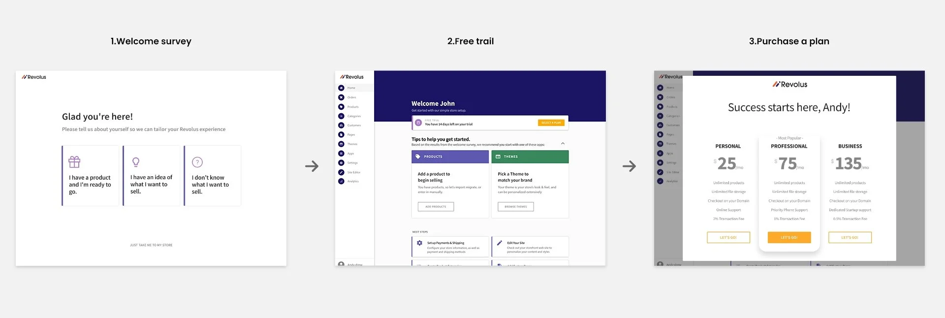 The sales team at Revolus has historically carried all the burden of selling the product to new trial users. We came to understand that a marker of a successful digital platform was the ability to sell itself via an optimized and streamlined onboarding process. The existing onboarding experience was disjointed with many points of disconnect and distraction leading to new users abandoning their trial stores.